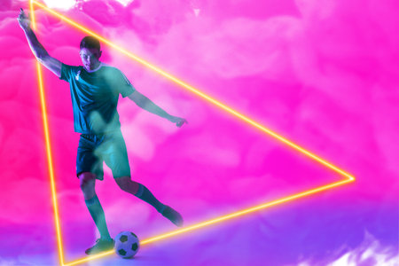 Caucasian male player playing with ball over illuminated triangle against pink neon background. Copy space, digital composite, sport, soccer, competition, neon, glowing, smoke and abstract concept.