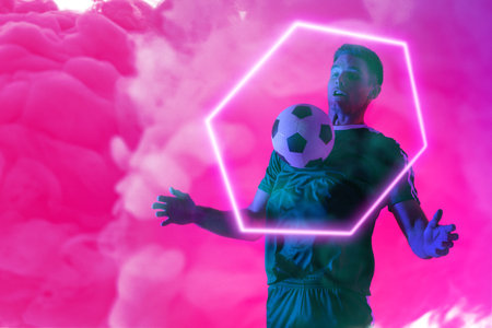 Caucasian male player playing with soccer ball over illuminated hexagon against pink neon smoke. Copy space, digital composite, sport, soccer, competition, neon, glowing and abstract concept.