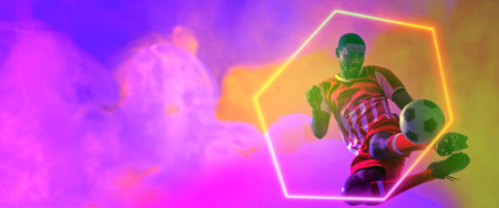 African american male player kicking soccer ball by illuminated hexagon on smoky background. Copy space, composite, sport, soccer, competition, neon, illustration, glowing, smoke and abstract concept