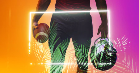 Midsection of american football player with ball and helmet over illuminated rectangle and plants. Copy space, composite, african american, sport, competition, illustration, glowing, nature, shape.