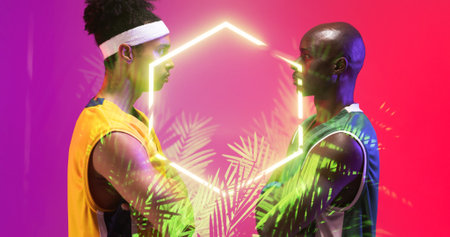 Side view of african american basketball players looking at each other by plants and hexagon. Copy space, composite, opponent, ball, sport, competition, illustration, illuminated, nature, shape.