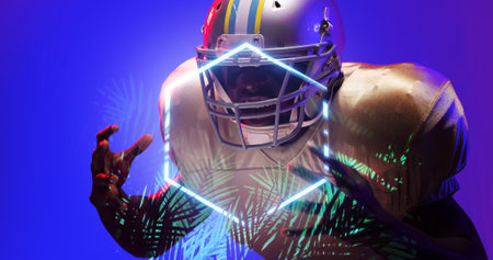 Composite of american football player wearing helmet gesturing by illuminated hexagon and plants. Copy space, blue, aggression, sport, competition, illustration, glowing, nature, shape and abstract.
