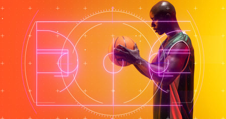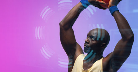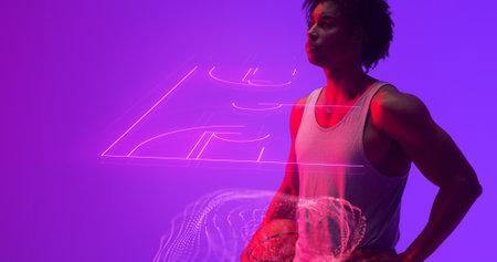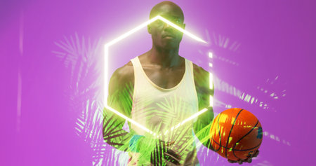 Side view of african american bald basketball player holding ball over lights on purple background. Composite, copy space, illuminated, sport, competition, illustration, shape and abstract concept.