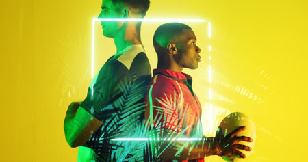 Composite of multiracial male players standing back to back by illuminated plants and square. Yellow, copy space, opponent, sport, competition, rugby, ball, nature, shape and abstract concept.