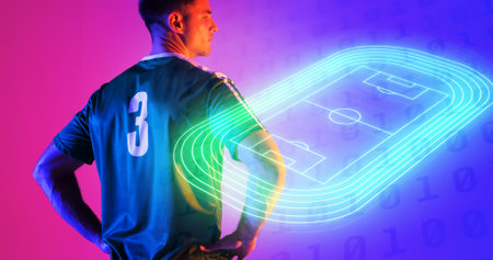 Confident caucasian player with arms akimbo by neon soccer field over blue and pink background. Computer graphic, copy space, digital composite, soccer, design, athlete, competitive sport.
