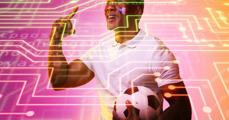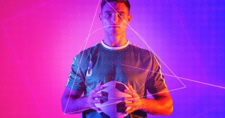 Portrait of determined caucasian athlete holding soccer ball with geometric neon design, copy space. Computer graphic, digital composite, soccer, design, athlete, competitive sport.