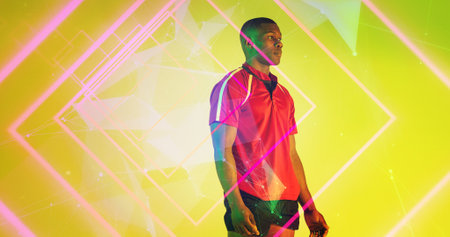 African american male with ball by illuminated triangle standing over pink smoky background. Copy space, composite, sport, soccer, competition, neon, illustration, glowing and abstract concept.