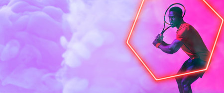 African american male player holding tennis racket by illuminated hexagon over smoky background. Copy space, composite, sport, competition, shape, playing, match and abstract concept.