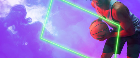 Midsection of biracial muscular basketball player holding ball by rectangle over smoky background. Copy space, composite, hand, illuminated, sport, competition, illustration, shape and abstract.