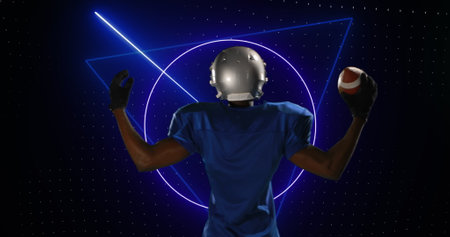 Digital composite of american football jumping over neon pattern against pink background, copy space. Computer graphic, skill, abstract, number, design, athlete, competitive sport.