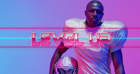 Image of level up text over american football player and neon lines. Sports and communication concept digitally generated image.