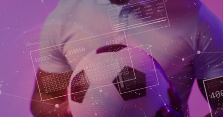 Midsection of caucasian male player holding soccer ball over illuminated plants and hexagon. Pink, copy space, blue, composite, sport, soccer, competition, neon, glowing and abstract concept.