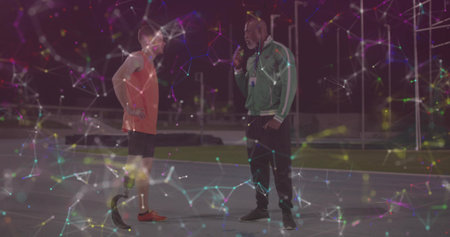 Coach interviewing athlete in sportswear on track at night with microphone and prosthetic blade. Athletics, mentorship, innovation, technology, motivation, performance, endurance