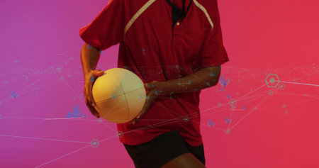 Caucasian young athlete with ball seen through geometric neon over molecular structure background. Computer graphic, copy space, abstract, digital composite, design, athlete, sport.