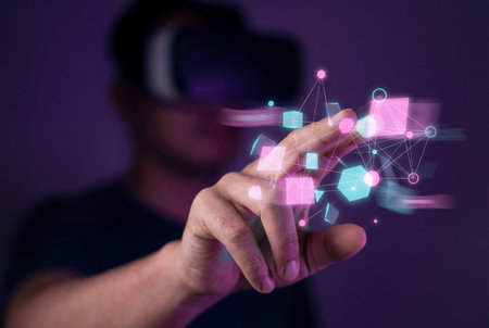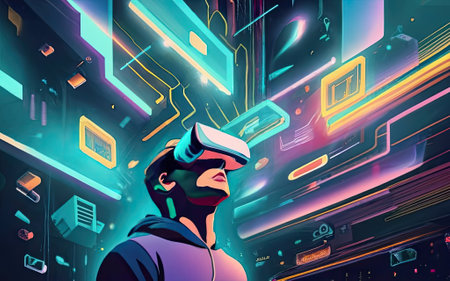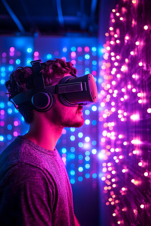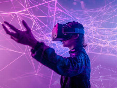 A person wearing a VR headset interacts with a digital environment, surrounded by neon light patterns.