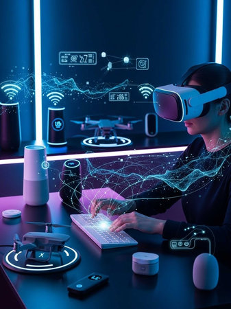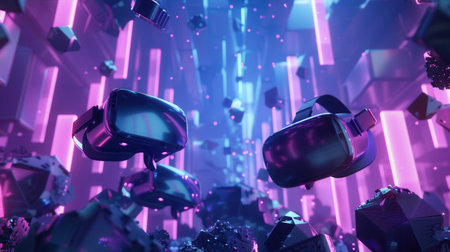 VR headsets and AR glasses float amidst a vibrant digital landscape, showing the immersive potential of virtual reality technology.
