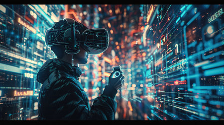 Man wearing a virtual reality headset immersed in a vibrant digital world with glowing purple and blue lights, representing futuristic technology and immersive experiences, vertical. High quality photo