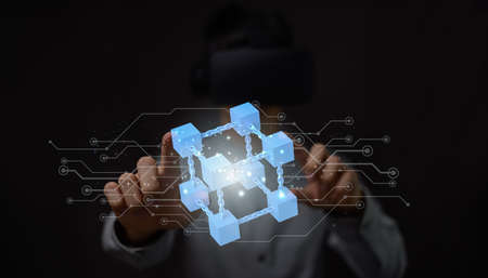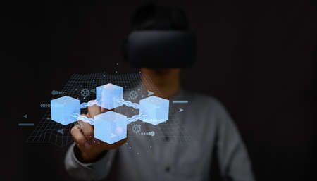 Metaverse and Blockchain Technology Concepts. Person Enjoying an Experiences of metaverse virtual digital technology game control with VR glasses, GameFi, 2022