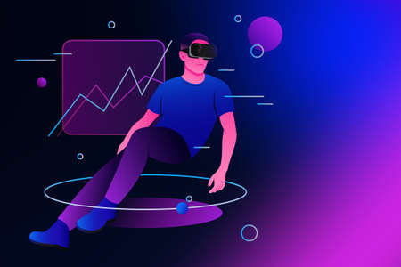 The guy is sitting in virtual reality. Neon retro style. The photo shows the effect of grain, noise.