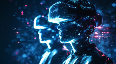 Virtual reality scene of two people wear VR interacting with holographic projections.