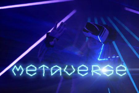 Female person using Virtual reality headset in metaverse universe. Experiencing virtual reality internet metaverse