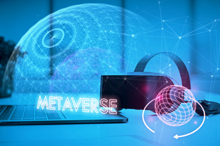 Close up of VR glasses on workplace with abstract creative metaverse hologram. Future, gadget and meta concept. double exposure