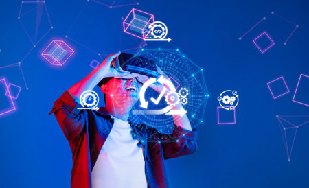 Discover the fusion of technology and agile business methodology, showcasing a person using virtual reality to enhance collaboration and optimize workflow efficiency in modern environments.