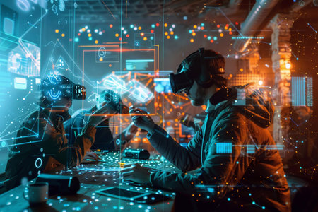 Explore a vibrant scene of virtual reality, where individuals engage with immersive music and dynamic visuals, creating a unique sensory experience.