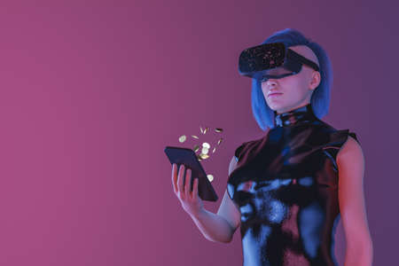 3d girl playing with mobile phone with coins around and VR goggles. neon lights. futuristic concept of metaverse, play to earn, nft and cryptocurrencies. 3d rendering