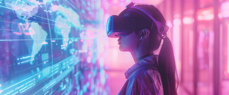 A young woman wearing a VR headset in a futuristic room with colorful neon lights She is engaged with a digital interface displaying world maps