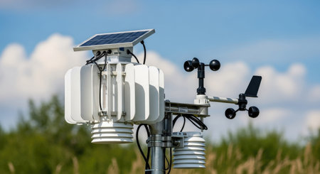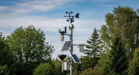 Weather station for monitoring ambient air pressure, humidity, wind vane and temperature in the forest and meadow in nature. Meteorology concept image