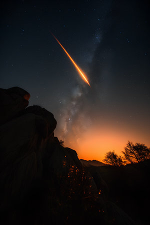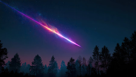 A brilliant meteor blazes across a vast, star-dusted night sky, leaving a luminous trail above a dark forest silhouette, capturing the awe-inspiring wonder of cosmic events, perfect for space and astronomy themes.