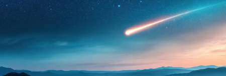 An illuminated meteor creates a bright trail across a dark blue expanse. The image features a gradient of colors, from deep blue to orange, suggesting a nighttime setting. The composition has a dynamic feel. Suitable for visual projects with conceptual themes or illustrative purposes.