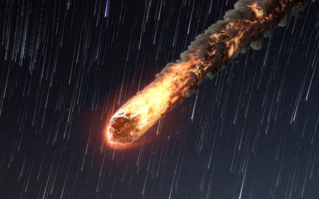 A massive space rock streaks through the cosmos, igniting in a fiery plume as it plunges toward Earth, creating a dramatic celestial spectacle.