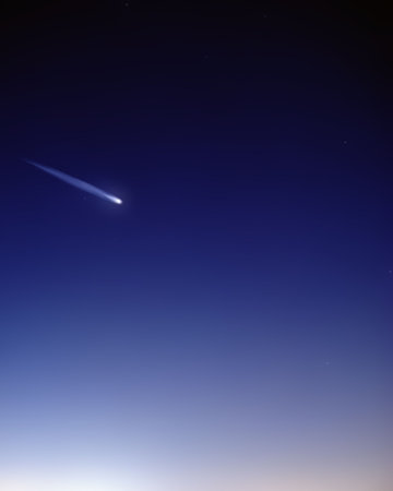 Stunning bright comet streaking across the dark night sky full of stars. Concept of outer space, celestial event, astronomy, and astrophotography. Beautiful cosmic phenomenon.