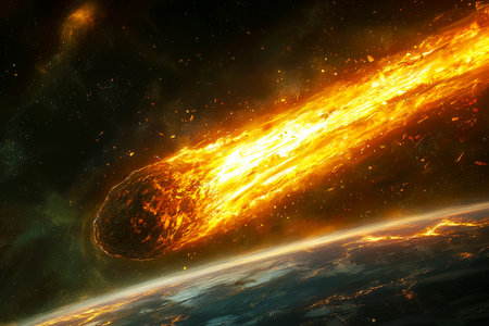 An asteroid hurtles through space, leaving a fiery trail as it approaches Earth, showing cosmic power and beauty.