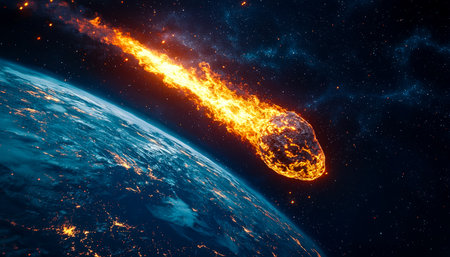 Massive asteroid with fiery, glowing tail hurtling toward Earth, illuminated by galaxy. Concept of cosmic catastrophe, apocalyptic scenarios, and fragility of life.