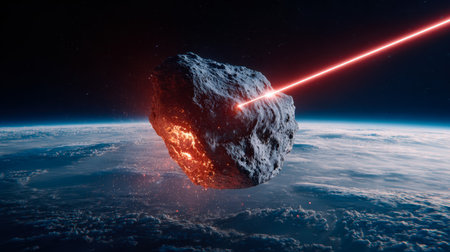 A distant view from orbit reveals a massive space rock streaking towards Earth, illuminated by a fiery laser trail, highlighting the planet's fragile glow.