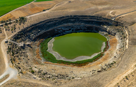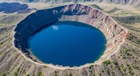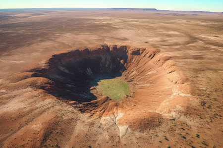AI Generated. Aerial view of a massive crater in a desert landscape during clear daylight