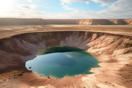 meteor crater filled with water, forming a natural lake, created with generative ai