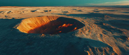 Aerial view of a massive impact crater formed by a meteorite collision on a desolate, sandy planet, highlighting the destructive power of cosmic events and the vastness of space