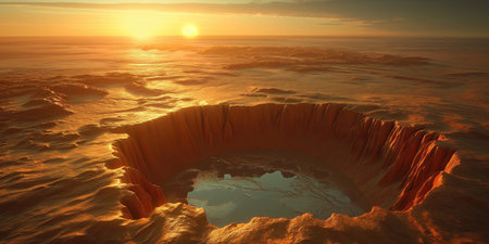 AI Generated. Water filled crater dominating martian landscape at sunset