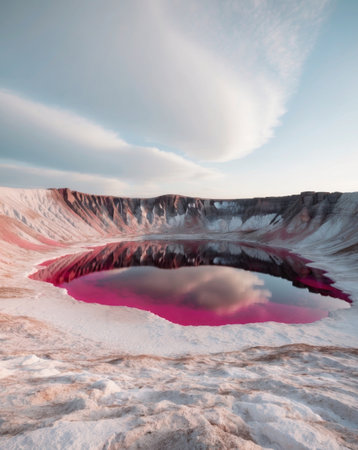 AI Generated. Crater featuring pink and white water along with salt deposits resulting from a meteor impact