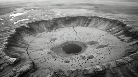 Dramatic aerial shot of a massive meteor crater surrounded by a barren landscape and scattered clouds, the impressive geological formations and natural beauty. is ideal for environmental studies, nature documentaries, or science fiction illustrations. Generative AI