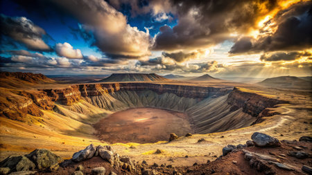 Witness the breathtaking spectacle of dawn illuminating a colossal crater in a desolate desert landscape The golden rays of the rising sun paint the horizon, casting an ethereal glow upon the towering crater walls and the rugged terrain beyond This extraordinary image captures the raw beauty and timeless allure of Earth's hidden natural wonders AI Generative