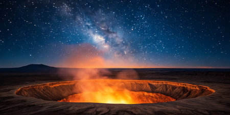 Burning gas crater in Turkmenistan desert creates a fiery scene at twilight