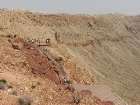 A group of viewers on the observation deck and two others descend stairs at Meteor Crater park in Arizona