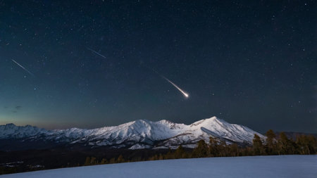 A breathtaking view of a night sky illuminated by a bright meteor shower, set against a backdrop of majestic mountains and sparkling stars.