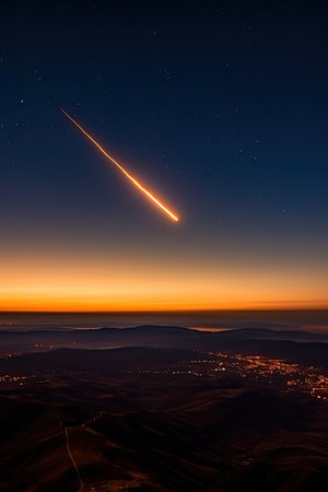 Breathtaking panoramic view of a desert mountain range at night, with a prominent meteor streaking across the inky sky. A valley below is illuminated by city lights, showcasing the contrast between the natural and urban landscapes.