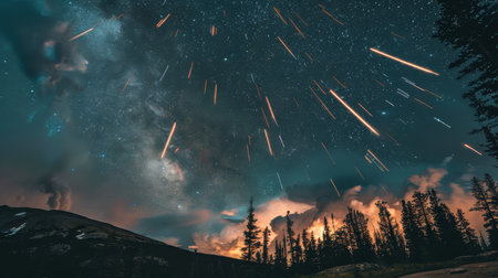 Meteor shower against the backdrop of a star-filled sky, capturing bright trails of shooting stars. Concept of astronomy, cosmos, space exploration, stargazing.